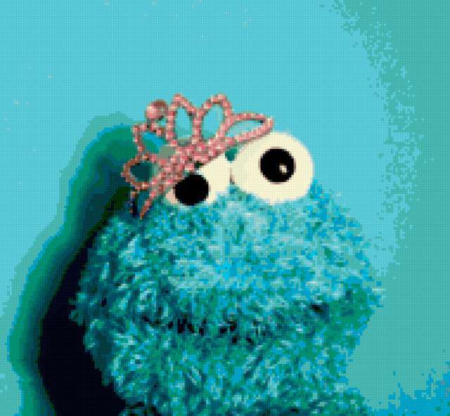 Ориентировочно так, схема вышивки «Cookie Monster», созданная автором krotte, будет выглядеть при отшиве на канве. Размер данной вышивки равен 190x176 крестов, при этом используется 42 цветов. Ключевые слова, по которым можно найти эту схему: игрушки, бирюзовый, глаза, прикол, игрушка, принцесса, корона, диадема. Также, вы можете взглянуть на оригинальную картинку, соответствующую данной схеме вышивки.