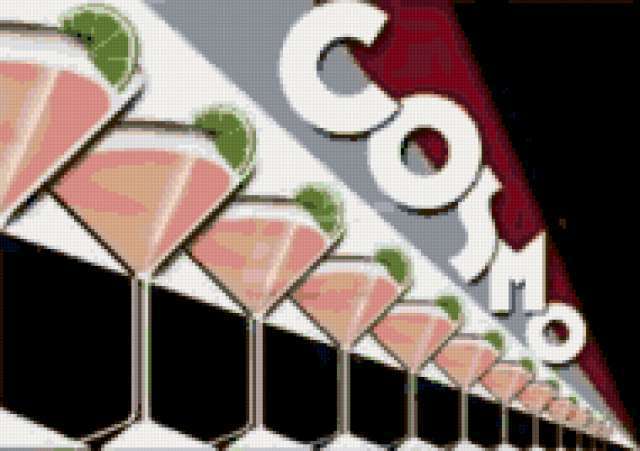 Ориентировочно так, схема вышивки «Cosmo Cocktails», созданная автором me4o, будет выглядеть при отшиве на канве. Размер данной вышивки равен 190x134 крестов, при этом используется 39 цветов. Ключевые слова, по которым можно найти эту схему: cocktail, decoration, delicious, exotic, kitchen. Также, вы можете взглянуть на оригинальную картинку, соответствующую данной схеме вышивки.