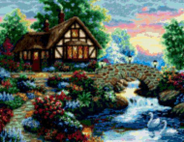 Ориентировочно так, схема вышивки «Cottage», созданная автором aniela, будет выглядеть при отшиве на канве. Размер данной вышивки равен 190x147 крестов, при этом используется 79 цветов. Ключевые слова, по которым можно найти эту схему: cottage, пейзаж, архитэктура, домики, garden. Также, вы можете взглянуть на оригинальную картинку, соответствующую данной схеме вышивки.