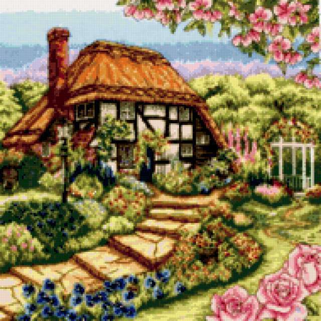 Ориентировочно так, схема вышивки «Cottage», созданная автором aniela, будет выглядеть при отшиве на канве. Размер данной вышивки равен 190x190 крестов, при этом используется 87 цветов. Ключевые слова, по которым можно найти эту схему: cottage, пейзаж, архитэктура, домики, garden. Также, вы можете взглянуть на оригинальную картинку, соответствующую данной схеме вышивки.