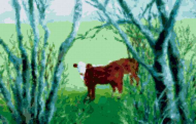Ориентировочно так, схема вышивки «Cows Painting», созданная автором me4o, будет выглядеть при отшиве на канве. Размер данной вышивки равен 190x121 крестов, при этом используется 38 цветов. Ключевые слова, по которым можно найти эту схему: cows, animals, field, painting, рисунок. Также, вы можете взглянуть на оригинальную картинку, соответствующую данной схеме вышивки.
