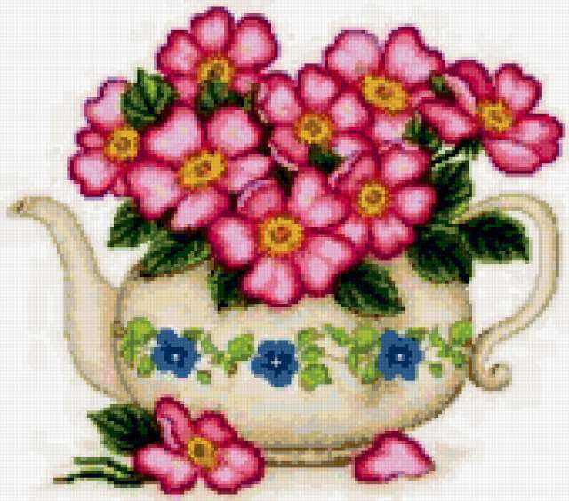 Ориентировочно так, схема вышивки «Cvetochnyj chaj», созданная автором Lamisa, будет выглядеть при отшиве на канве. Размер данной вышивки равен 170x150 крестов, при этом используется 76 цветов. Ключевые слова, по которым можно найти эту схему: цветы, кухня, посуда. Также, вы можете взглянуть на оригинальную картинку, соответствующую данной схеме вышивки.