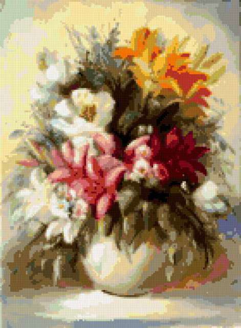 Ориентировочно так, схема вышивки «Cvety», созданная автором lukrecija12, будет выглядеть при отшиве на канве. Размер данной вышивки равен 140x190 крестов, при этом используется 44 цветов. Ключевые слова, по которым можно найти эту схему: cvety. Также, вы можете взглянуть на оригинальную картинку, соответствующую данной схеме вышивки.