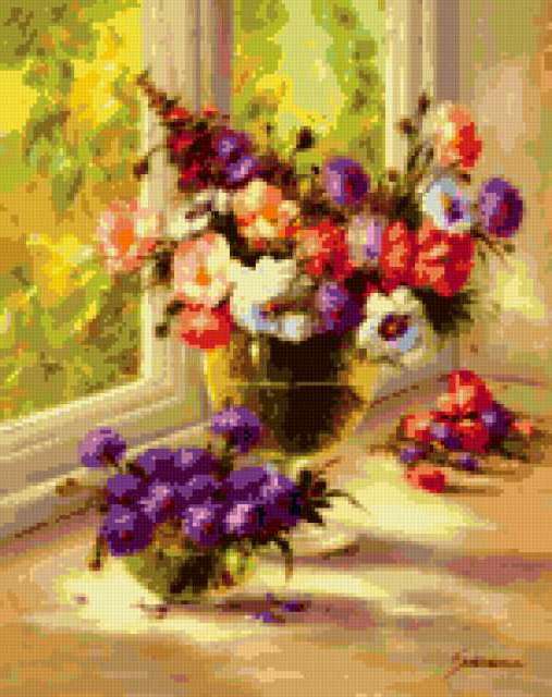 Ориентировочно так, схема вышивки «Cvety», созданная автором lukrecija12, будет выглядеть при отшиве на канве. Размер данной вышивки равен 149x188 крестов, при этом используется 52 цветов. Ключевые слова, по которым можно найти эту схему: flower. Также, вы можете взглянуть на оригинальную картинку, соответствующую данной схеме вышивки.