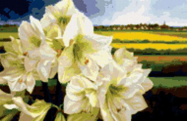 Ориентировочно так, схема вышивки «Cvety», созданная автором lukrecija12, будет выглядеть при отшиве на канве. Размер данной вышивки равен 190x124 крестов, при этом используется 57 цветов. Ключевые слова, по которым можно найти эту схему: cvety. Также, вы можете взглянуть на оригинальную картинку, соответствующую данной схеме вышивки.