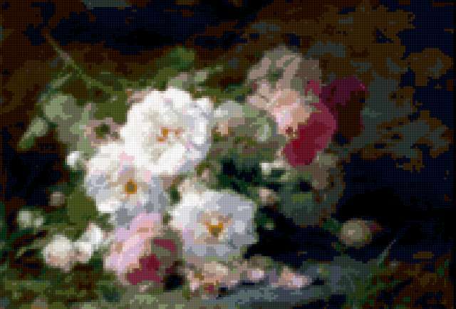 Ориентировочно так, схема вышивки «Cvety», созданная автором lukrecija12, будет выглядеть при отшиве на канве. Размер данной вышивки равен 190x129 крестов, при этом используется 46 цветов. Ключевые слова, по которым можно найти эту схему: cvety. Также, вы можете взглянуть на оригинальную картинку, соответствующую данной схеме вышивки.