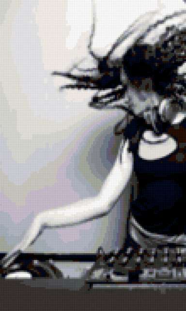 Ориентировочно так, схема вышивки «DJ», созданная автором lianchik_89, будет выглядеть при отшиве на канве. Размер данной вышивки равен 110x183 крестов, при этом используется 26 цветов. Ключевые слова, по которым можно найти эту схему: музыка, девушка. Также, вы можете взглянуть на оригинальную картинку, соответствующую данной схеме вышивки.