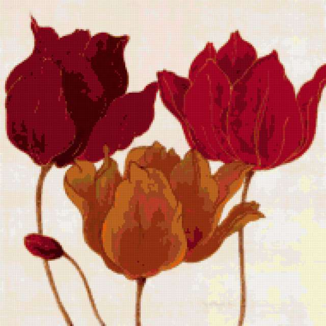 Ориентировочно так, схема вышивки «Dancing Tulips», созданная автором pandreevska, будет выглядеть при отшиве на канве. Размер данной вышивки равен 190x190 крестов, при этом используется 36 цветов. Ключевые слова, по которым можно найти эту схему: flower, dance, colorful, decoration. Также, вы можете взглянуть на оригинальную картинку, соответствующую данной схеме вышивки.