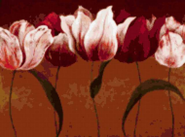Ориентировочно так, схема вышивки «Dancing Tulips», созданная автором pandreevska, будет выглядеть при отшиве на канве. Размер данной вышивки равен 190x141 крестов, при этом используется 42 цветов. Ключевые слова, по которым можно найти эту схему: flower, dance, colorful, decoration. Также, вы можете взглянуть на оригинальную картинку, соответствующую данной схеме вышивки.