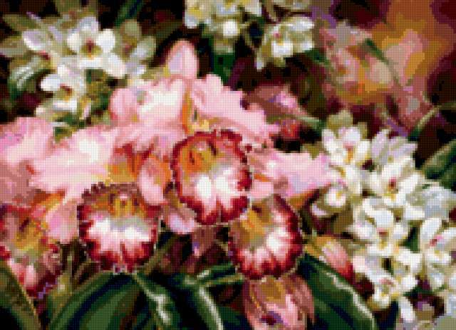 Ориентировочно так, схема вышивки «Darryl Trott», созданная автором AllaBira, будет выглядеть при отшиве на канве. Размер данной вышивки равен 190x138 крестов, при этом используется 85 цветов. Ключевые слова, по которым можно найти эту схему: Still Life. Также, вы можете взглянуть на оригинальную картинку, соответствующую данной схеме вышивки.