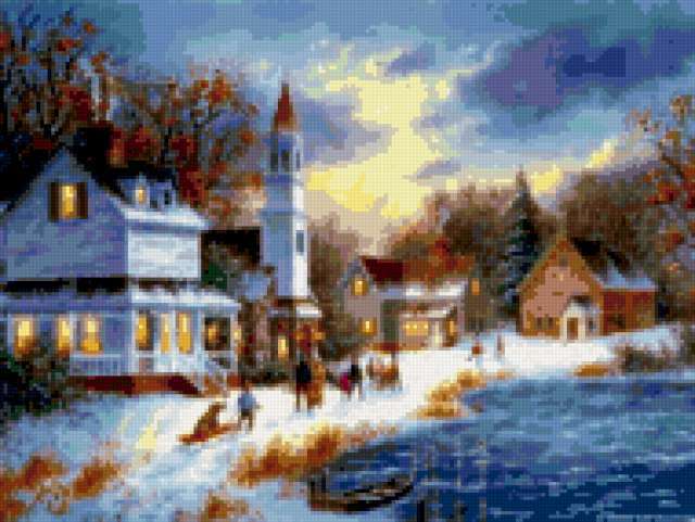 Ориентировочно так, схема вышивки «Dennis Lewan», созданная автором Axlamonka, будет выглядеть при отшиве на канве. Размер данной вышивки равен 190x143 крестов, при этом используется 79 цветов. Ключевые слова, по которым можно найти эту схему: пейзаж, зима, игры, река, домики. Также, вы можете взглянуть на оригинальную картинку, соответствующую данной схеме вышивки.