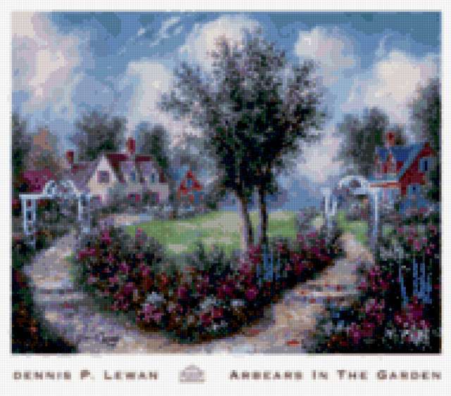 Ориентировочно так, схема вышивки «Dennis Lewan», созданная автором Axlamonka, будет выглядеть при отшиве на канве. Размер данной вышивки равен 190x167 крестов, при этом используется 75 цветов. Ключевые слова, по которым можно найти эту схему: пейзаж, домики, дорожка, цветы. Также, вы можете взглянуть на оригинальную картинку, соответствующую данной схеме вышивки.