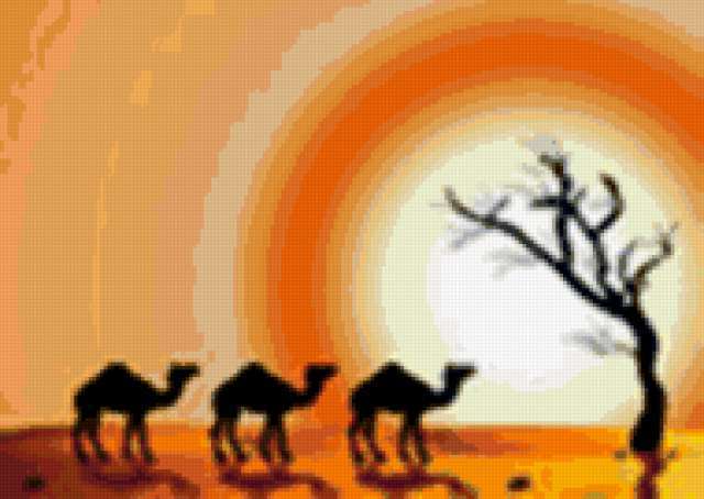 Ориентировочно так, схема вышивки «Desert», созданная автором osana, будет выглядеть при отшиве на канве. Размер данной вышивки равен 190x135 крестов, при этом используется 58 цветов. Ключевые слова, по которым можно найти эту схему: восток, оаэ, саудовская аравия, джидда, арабы, никаб, паранджа, чадра, хиджаб, минареты, мечеть, ислам, женщины востока. Также, вы можете взглянуть на оригинальную картинку, соответствующую данной схеме вышивки.