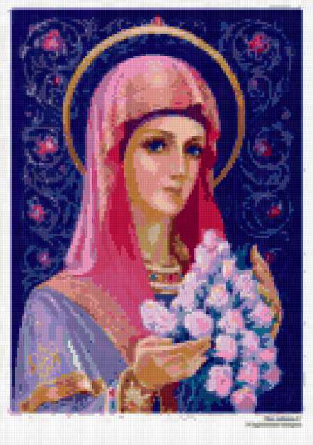 Ориентировочно так, схема вышивки «Deva marija», созданная автором lukrecija12, будет выглядеть при отшиве на канве. Размер данной вышивки равен 129x183 крестов, при этом используется 44 цветов. Ключевые слова, по которым можно найти эту схему: religija. Также, вы можете взглянуть на оригинальную картинку, соответствующую данной схеме вышивки.