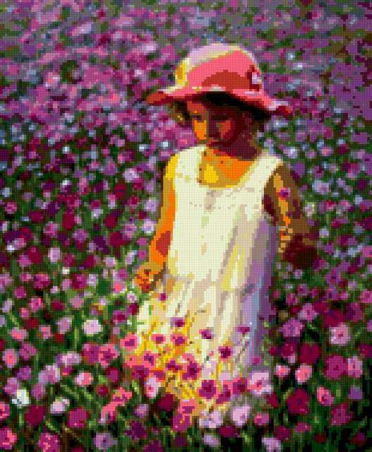 Ориентировочно так, схема вышивки «Devochka», созданная автором lukrecija12, будет выглядеть при отшиве на канве. Размер данной вышивки равен 155x188 крестов, при этом используется 48 цветов. Ключевые слова, по которым можно найти эту схему: deti, rebionok. Также, вы можете взглянуть на оригинальную картинку, соответствующую данной схеме вышивки.