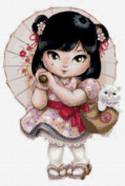 Ориентировочно так, схема вышивки «Devochka», созданная автором lukrecija12, будет выглядеть при отшиве на канве. Размер данной вышивки равен 119x176 крестов, при этом используется 46 цветов. Ключевые слова, по которым можно найти эту схему: deti, rebionok. Также, вы можете взглянуть на оригинальную картинку, соответствующую данной схеме вышивки.