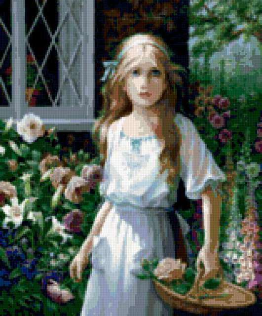 Ориентировочно так, схема вышивки «Devochka6», созданная автором lukrecija12, будет выглядеть при отшиве на канве. Размер данной вышивки равен 157x189 крестов, при этом используется 68 цветов. Ключевые слова, по которым можно найти эту схему: deti, rebionok. Также, вы можете взглянуть на оригинальную картинку, соответствующую данной схеме вышивки.