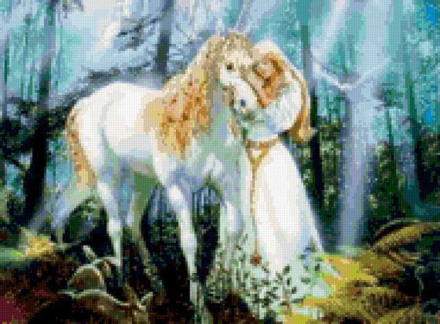 Ориентировочно так, схема вышивки «Devuska i lowadj», созданная автором Vikusja, будет выглядеть при отшиве на канве. Размер данной вышивки равен 190x140 крестов, при этом используется 82 цветов. К несчастью, автор не назначил для схемы ключевые слова. Также, вы можете взглянуть на оригинальную картинку, соответствующую данной схеме вышивки.