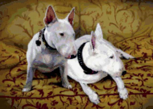 Ориентировочно так, схема вышивки «Dogs», созданная автором aniela, будет выглядеть при отшиве на канве. Размер данной вышивки равен 190x135 крестов, при этом используется 67 цветов. Ключевые слова, по которым можно найти эту схему: животные, pets, animals. Также, вы можете взглянуть на оригинальную картинку, соответствующую данной схеме вышивки.