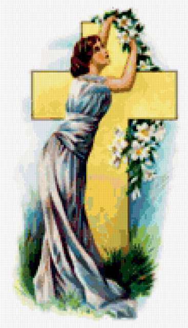 Ориентировочно так, схема вышивки «Easter», созданная автором aniela, будет выглядеть при отшиве на канве. Размер данной вышивки равен 109x190 крестов, при этом используется 85 цветов. Ключевые слова, по которым можно найти эту схему: religion. Также, вы можете взглянуть на оригинальную картинку, соответствующую данной схеме вышивки.