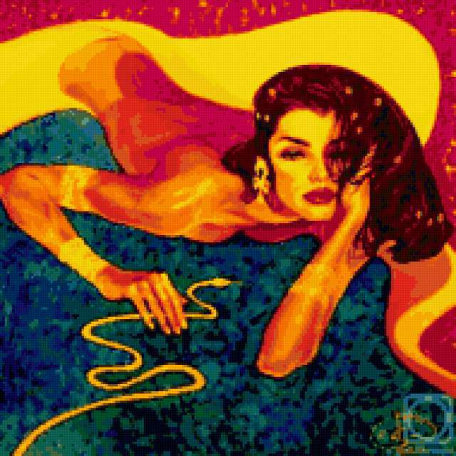 Ориентировочно так, схема вышивки «Egiptianka», созданная автором lukrecija12, будет выглядеть при отшиве на канве. Размер данной вышивки равен 190x190 крестов, при этом используется 39 цветов. Ключевые слова, по которым можно найти эту схему: zenshina, vostok. Также, вы можете взглянуть на оригинальную картинку, соответствующую данной схеме вышивки.