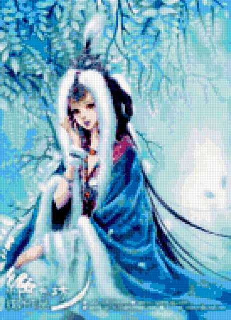 Ориентировочно так, схема вышивки «Eis Princess», созданная автором iborissova, будет выглядеть при отшиве на канве. Размер данной вышивки равен 137x190 крестов, при этом используется 54 цветов. Ключевые слова, по которым можно найти эту схему: девушка, дети. Также, вы можете взглянуть на оригинальную картинку, соответствующую данной схеме вышивки.