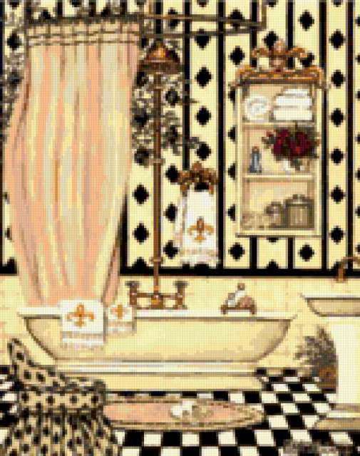 Ориентировочно так, схема вышивки «Elegant Bath», созданная автором iborissova, будет выглядеть при отшиве на канве. Размер данной вышивки равен 150x190 крестов, при этом используется 50 цветов. Ключевые слова, по которым можно найти эту схему: interior. Также, вы можете взглянуть на оригинальную картинку, соответствующую данной схеме вышивки.