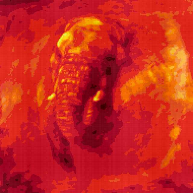 Ориентировочно так, схема вышивки «Elephant Canvas Middle», созданная автором me4o, будет выглядеть при отшиве на канве. Размер данной вышивки равен 190x190 крестов, при этом используется 24 цветов. Ключевые слова, по которым можно найти эту схему: elephant, canvas, fire, bright. Также, вы можете взглянуть на оригинальную картинку, соответствующую данной схеме вышивки.