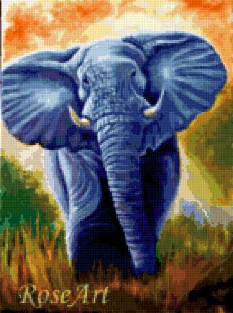 Ориентировочно так, схема вышивки «Elephant», созданная автором aniela, будет выглядеть при отшиве на канве. Размер данной вышивки равен 142x190 крестов, при этом используется 77 цветов. Ключевые слова, по которым можно найти эту схему: wildlife, animals, животные, слон. Также, вы можете взглянуть на оригинальную картинку, соответствующую данной схеме вышивки.