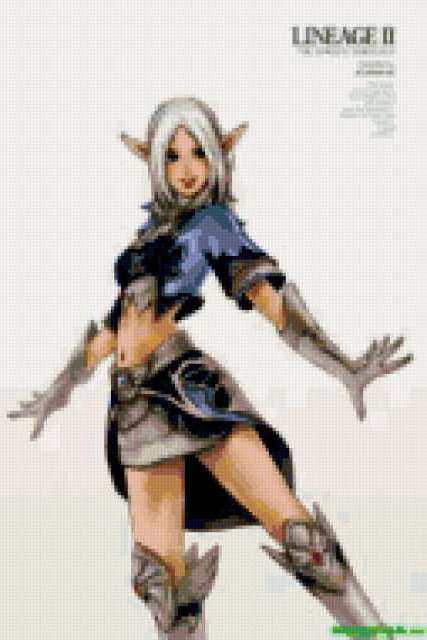 Ориентировочно так, схема вышивки «Elf», созданная автором AppleJuice, будет выглядеть при отшиве на канве. Размер данной вышивки равен 127x190 крестов, при этом используется 48 цветов. Ключевые слова, по которым можно найти эту схему: lineage2, девушка, эльф. Также, вы можете взглянуть на оригинальную картинку, соответствующую данной схеме вышивки.