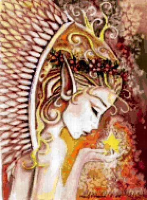 Ориентировочно так, схема вышивки «Elfa con estrella», созданная автором lila, будет выглядеть при отшиве на канве. Размер данной вышивки равен 139x189 крестов, при этом используется 67 цветов. Ключевые слова, по которым можно найти эту схему: haes. Также, вы можете взглянуть на оригинальную картинку, соответствующую данной схеме вышивки.