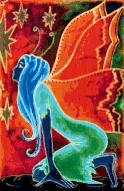 Ориентировочно так, схема вышивки «Fairy», созданная автором aniela, будет выглядеть при отшиве на канве. Размер данной вышивки равен 124x190 крестов, при этом используется 64 цветов. Ключевые слова, по которым можно найти эту схему: фэнтези, fantasy, fairy. Также, вы можете взглянуть на оригинальную картинку, соответствующую данной схеме вышивки.