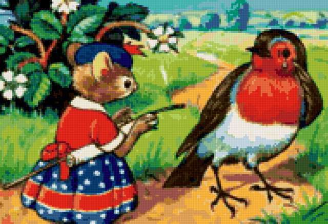 Ориентировочно так, схема вышивки «Fairytale Pictures», созданная автором pandreevska, будет выглядеть при отшиве на канве. Размер данной вышивки равен 190x130 крестов, при этом используется 59 цветов. Ключевые слова, по которым можно найти эту схему: детская комната, fairytale, mouse, bird. Также, вы можете взглянуть на оригинальную картинку, соответствующую данной схеме вышивки.
