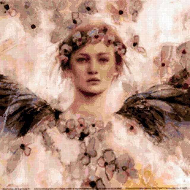 Ориентировочно так, схема вышивки «Fantasy», созданная автором aniela, будет выглядеть при отшиве на канве. Размер данной вышивки равен 190x190 крестов, при этом используется 58 цветов. Ключевые слова, по которым можно найти эту схему: фэнтези, fantasy, angel. Также, вы можете взглянуть на оригинальную картинку, соответствующую данной схеме вышивки.