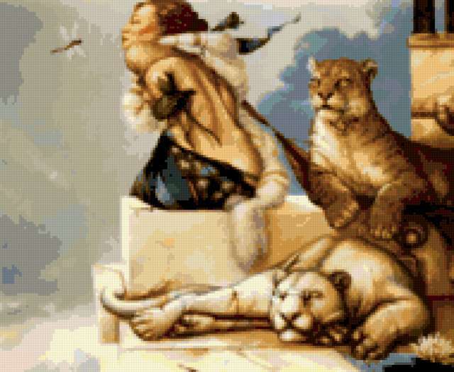 Ориентировочно так, схема вышивки «Fantazija», созданная автором lukrecija12, будет выглядеть при отшиве на канве. Размер данной вышивки равен 190x156 крестов, при этом используется 54 цветов. Ключевые слова, по которым можно найти эту схему: zenshina, zivotnye. Также, вы можете взглянуть на оригинальную картинку, соответствующую данной схеме вышивки.