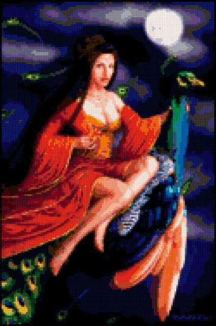 Ориентировочно так, схема вышивки «Feja», созданная автором lukrecija12, будет выглядеть при отшиве на канве. Размер данной вышивки равен 125x188 крестов, при этом используется 53 цветов. Ключевые слова, по которым можно найти эту схему: zenchina, boginia. Также, вы можете взглянуть на оригинальную картинку, соответствующую данной схеме вышивки.
