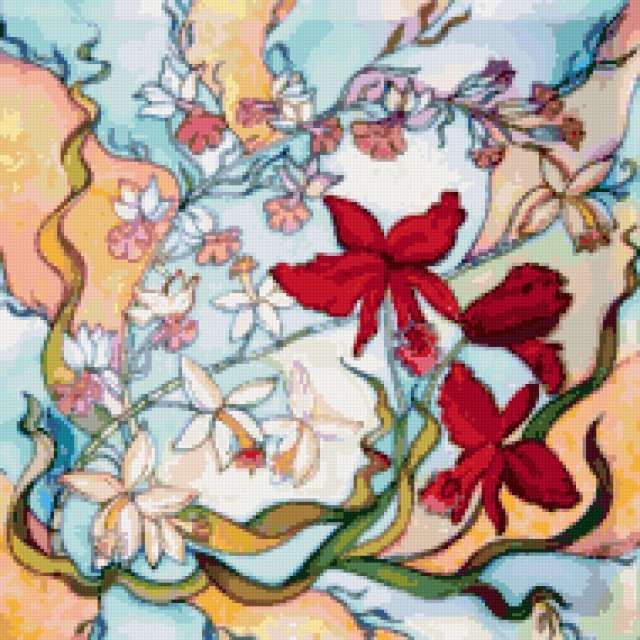 Ориентировочно так, схема вышивки «Floral Decoration», созданная автором pandreevska, будет выглядеть при отшиве на канве. Размер данной вышивки равен 190x190 крестов, при этом используется 63 цветов. Ключевые слова, по которым можно найти эту схему: floral, цветок, декорация, colorful. Также, вы можете взглянуть на оригинальную картинку, соответствующую данной схеме вышивки.