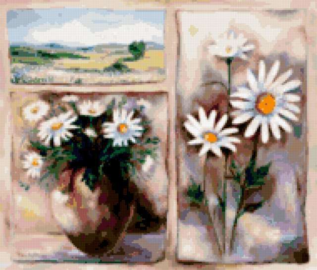 Ориентировочно так, схема вышивки «Flowers Collage - Daisy», созданная автором pandreevska, будет выглядеть при отшиве на канве. Размер данной вышивки равен 190x162 крестов, при этом используется 60 цветов. Ключевые слова, по которым можно найти эту схему: flower, decoration, collage. Также, вы можете взглянуть на оригинальную картинку, соответствующую данной схеме вышивки.