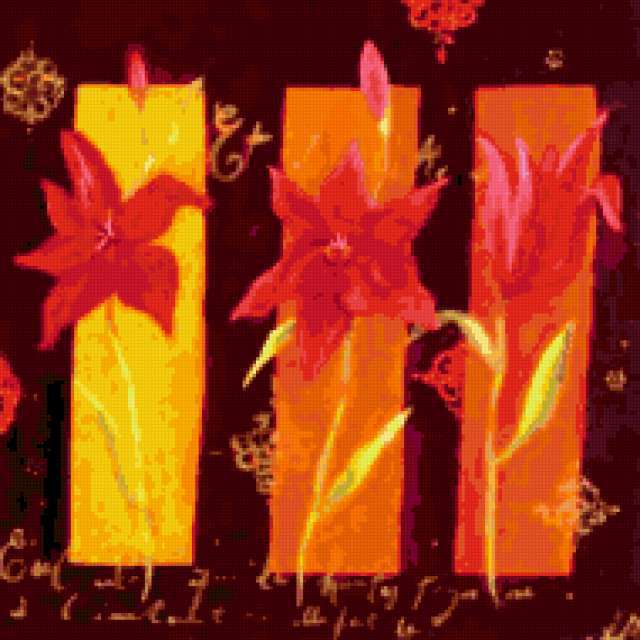 Ориентировочно так, схема вышивки «Flowers Trio - Lilies», созданная автором pandreevska, будет выглядеть при отшиве на канве. Размер данной вышивки равен 190x190 крестов, при этом используется 45 цветов. Ключевые слова, по которым можно найти эту схему: floral, elegance, цветок, декорация, modern, trio. Также, вы можете взглянуть на оригинальную картинку, соответствующую данной схеме вышивки.