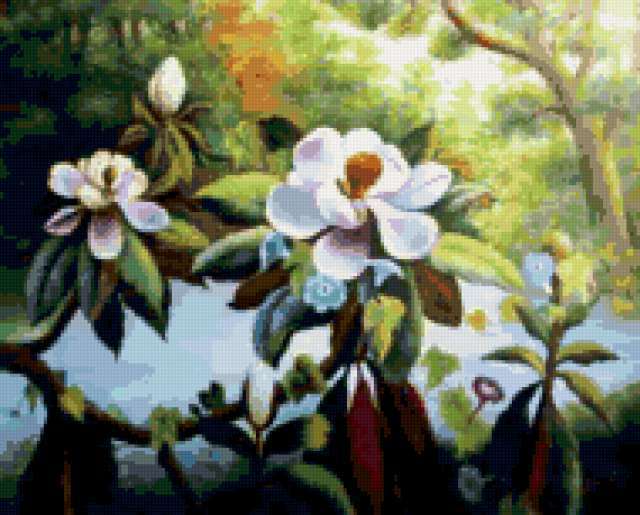 Ориентировочно так, схема вышивки «Flowers», созданная автором aniela, будет выглядеть при отшиве на канве. Размер данной вышивки равен 190x153 крестов, при этом используется 79 цветов. Ключевые слова, по которым можно найти эту схему: цветы, flowers, landscape. Также, вы можете взглянуть на оригинальную картинку, соответствующую данной схеме вышивки.