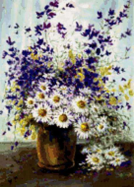 Ориентировочно так, схема вышивки «Flowers», созданная автором aniela, будет выглядеть при отшиве на канве. Размер данной вышивки равен 136x190 крестов, при этом используется 82 цветов. Ключевые слова, по которым можно найти эту схему: натюрморт, цветы, flowers, naturmort, still life. Также, вы можете взглянуть на оригинальную картинку, соответствующую данной схеме вышивки.