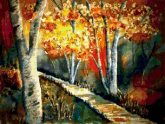 Ориентировочно так, схема вышивки «Forest», созданная автором aniela, будет выглядеть при отшиве на канве. Размер данной вышивки равен 190x143 крестов, при этом используется 81 цветов. Ключевые слова, по которым можно найти эту схему: пейзаж, landscape, forest. Также, вы можете взглянуть на оригинальную картинку, соответствующую данной схеме вышивки.