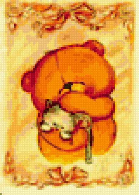 Ориентировочно так, схема вышивки «ForeverFriends», созданная автором mozgopudra, будет выглядеть при отшиве на канве. Размер данной вышивки равен 80x112 крестов, при этом используется 38 цветов. Ключевые слова, по которым можно найти эту схему: мишка. Также, вы можете взглянуть на оригинальную картинку, соответствующую данной схеме вышивки.