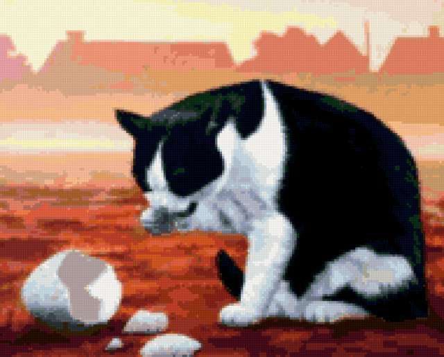 Ориентировочно так, схема вышивки «Francois Knopf», созданная автором malkinaiv, будет выглядеть при отшиве на канве. Размер данной вышивки равен 190x153 крестов, при этом используется 57 цветов. Ключевые слова, по которым можно найти эту схему: картина, коты, кошки, животные. Также, вы можете взглянуть на оригинальную картинку, соответствующую данной схеме вышивки.