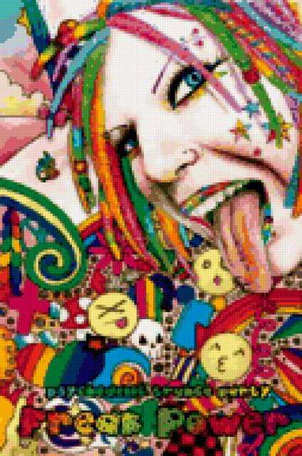 Ориентировочно так, схема вышивки «Freak Power», созданная автором spell_17, будет выглядеть при отшиве на канве. Размер данной вышивки равен 126x190 крестов, при этом используется 90 цветов. Ключевые слова, по которым можно найти эту схему: фрик. Также, вы можете взглянуть на оригинальную картинку, соответствующую данной схеме вышивки.
