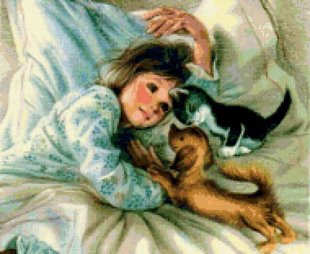 Ориентировочно так, схема вышивки «Friends», созданная автором aniela, будет выглядеть при отшиве на канве. Размер данной вышивки равен 190x156 крестов, при этом используется 84 цветов. Ключевые слова, по которым можно найти эту схему: девочка, girl. Также, вы можете взглянуть на оригинальную картинку, соответствующую данной схеме вышивки.