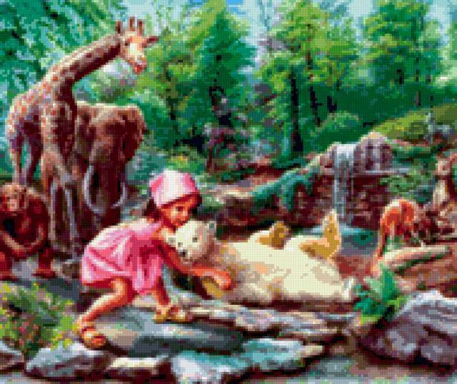 Ориентировочно так, схема вышивки «Friends», созданная автором aniela, будет выглядеть при отшиве на канве. Размер данной вышивки равен 190x160 крестов, при этом используется 85 цветов. Ключевые слова, по которым можно найти эту схему: девочка, girl, wildlife. Также, вы можете взглянуть на оригинальную картинку, соответствующую данной схеме вышивки.