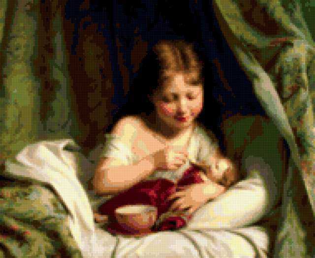 Ориентировочно так, схема вышивки «Fritz Zuber-Buhler», созданная автором malkinaiv, будет выглядеть при отшиве на канве. Размер данной вышивки равен 190x156 крестов, при этом используется 67 цветов. Ключевые слова, по которым можно найти эту схему: картина, дети, девочка, кукла. Также, вы можете взглянуть на оригинальную картинку, соответствующую данной схеме вышивки.