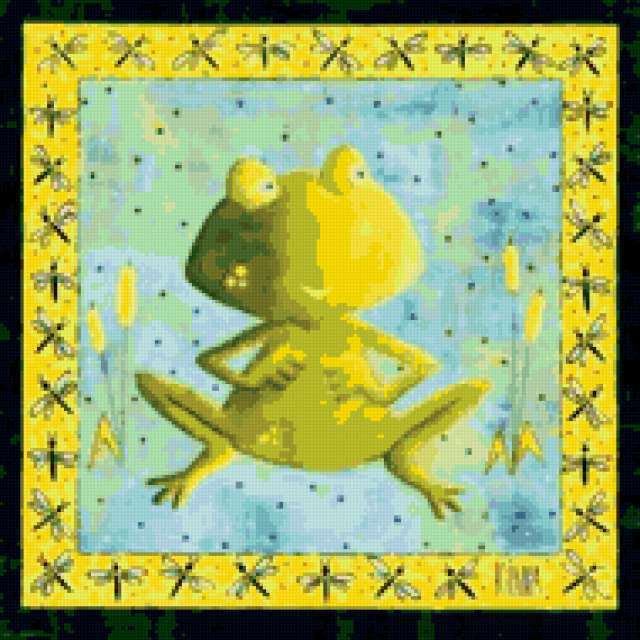 Ориентировочно так, схема вышивки «Frog», созданная автором aniela, будет выглядеть при отшиве на канве. Размер данной вышивки равен 190x190 крестов, при этом используется 52 цветов. Ключевые слова, по которым можно найти эту схему: wildlife, animals, животные. Также, вы можете взглянуть на оригинальную картинку, соответствующую данной схеме вышивки.