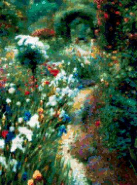 Ориентировочно так, схема вышивки «GREG SINGLEY», созданная автором malkinaiv, будет выглядеть при отшиве на канве. Размер данной вышивки равен 141x190 крестов, при этом используется 81 цветов. Ключевые слова, по которым можно найти эту схему: картина, цветы, сады, парки, дорожка. Также, вы можете взглянуть на оригинальную картинку, соответствующую данной схеме вышивки.